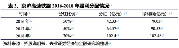 2016-2018年,京沪高铁分红率约为50%、50%、70%,分红可观。2016年,公司按照可供股东分配利润的50%分红,共分配利润42.34亿元(每10股0.3241元)。2017年,公司按照可供股东分配利润的50%分红,共分配利润64.57亿元(每10股0.4943元)。2018年,公司按照可供股东分配利润的70%分红共分配利润102.40亿元(每10股2.56元)。