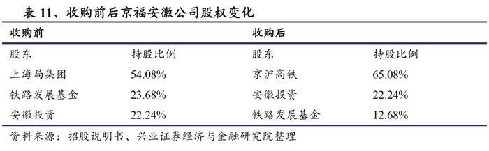 收购交割后,京沪高铁将拥有京福安徽公司65.08%的股份,安徽投资占股22.24%,铁路发展基金占股12.68%。