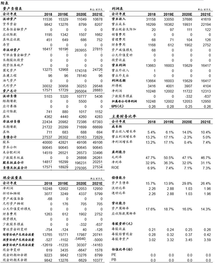 盈利预测:在不提价假设下,我们预计2019-2022年,京沪高铁净利润120亿元、124亿元、136亿元、144亿元,京福安徽公司净利润-11亿元、-8亿元、-17亿元、-8亿元,收购并表后,京沪高铁归母净利润分别为120亿元、121亿元、130亿元、139亿元,EPS分别为0.28元、0.25元(摊薄后)、0.26元(摊薄后)、0.28元(摊薄后)。未来3年影响公司业绩的主要变量假设为:1)京沪高铁本线运量增长1%、跨线客流量增长6%-10%,自然客流量增长带来业绩贡献。2)2019Q4起京沪高铁新增土地摊销成本,致使成本2020Q1-3总成本增加。3)2020募投项目京福公司亏损,且预计2020-2021尚有200亿资本开支,在建项目约有800亿将在2022年初转固拖累业绩,我们预计募投项目未来3年均将拖累整体看业绩。4)2020年IPO,EPS摊薄。