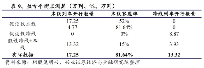 在开行13.32万列的跨线列车以及3.93万列的本线列车时,本线列车的客座率需达到15%,可达到公司的盈亏平衡点。