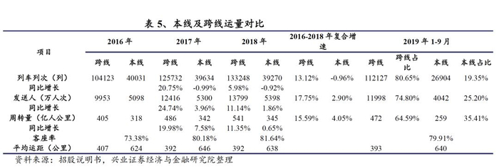 大幅增开跨线列车,开行列次、发送旅客人数、周转量均快速增长。随着路网的完善,聚集效应逐渐显现,京沪高速铁路跨线列车数量增加,是客运量增长的主要来源。2019年3Q列车发送占比80.65%,发送旅客人数占比74.80%,周转量占比64.59%。2016-2018年,跨线列车开行列次复合增长13.12%,发送旅客人次复合增长17.75%,周转量复合增长15.59%。2019年3Q跨线列车平均运距393千米,近几年较为稳定。