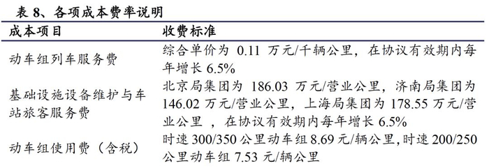 变动成本受列车开行数量及客座率影响。公司生产经营发生的折旧、维修维护、委托运输管理费是较为稳定的成本。公司发生的变动成本中,高铁运输能力保障费用与公司的营业收入呈正比关系,因此列车开行数量以及客座率对高铁运输能力保障费用都会产生直接影响;电费、动车组使用费用主要与列车开行数量相关,与客座率的相关性较小,因此列车开行数量会对上述变动成本产生直接影响。