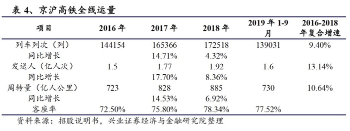 过去三年,受大幅加开跨线列车影响,京沪高铁客运量快速增长,同时客座率也略有提升。2018年京沪高铁全线开行列车172518次,同比增长4.43%,2016-2018年复合增速为9.40%,发送旅客1.92亿人次,同比增长8.36%,2016-2018年复合增速为12.94%,周转量达885亿人公里,同比增长6.92%,2016-2018年复合增速为10.66%。2019年前三季度,累积开行列车139031次,发送旅客1.60亿人次,周转量达730亿人公里。客座率从2016年的72.50%上升到目前78%左右。
