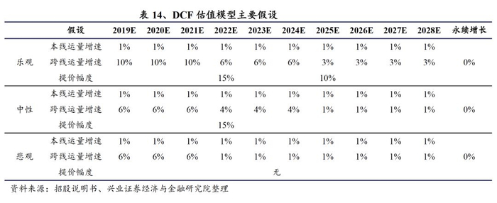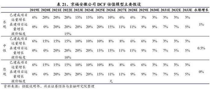 假设京福安徽公司负债率维持现有水平,在DCF估值中,我们对公司未来营业情况分别进行了乐观、中性、悲观三种情况的假设。假设如下: