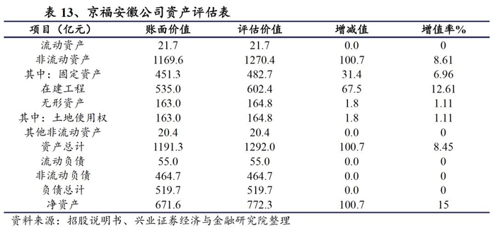 资产基础法下评估价值较账面价值增值100.72亿元,主要来源于固定资产增值。京福安徽公司账面权益价值为671.60亿元,资产基础法下评估价值为772.32亿元,增值额为100.72亿元,增值率为15%,收益法下评估价值为712.99亿元,增值额为41.39亿元,增值率为6.16%。由于公司有两条在建线路没有可参考历史数据,因此采用资产基础法更为合理。在资产基础法下的增值来源是固定资产、在建工程评估增值。增值原因主要是重置价值较建造日有一定幅度的增长,以及会计折旧年限和资本化利息与评估时不同。