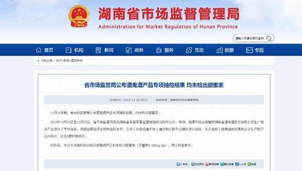 湖南省市场监督管理局12月25日发布称,对市场上销售的酒鬼酒相关产品进行了专项抽检,抽查的30个批次酒鬼酒均未检出甜蜜素,符合标准。同时发布了近三年湖南省白酒抽检监测情况,称:全国各级市场监管部门(含原食品药品监管部门)于2017-2019年期间,对酒鬼酒股份有限公司生产的白酒抽检监测总计64批次,全部合格。