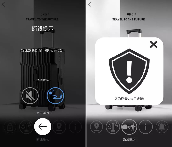 在手机蓝牙连接箱子的情况下,如果箱子离你太远、超过蓝牙连接范围,或者信号被遮挡,它就会滴滴地响,手机也会收到警报。