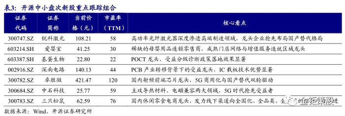 开源证券中小盘次新股重点跟踪组合,包括:锐科激光(高功率光纤激光器深度渗透高端制造领域,龙头企业抢先布局国产替代格局)、爱婴室(稀缺的母婴连锁零售商,受益于母婴消费品牌化升级和行业集中度提升)、基蛋生物(POCT龙头,受益分级诊断政策落地效果显著)、深南电路(PCB产业转移背景下的受益龙头,IC载板技术优势显著)、卓胜微(国内射频前端芯片龙头,5G商用化与国产替代双轮驱动)、中石科技(主攻导热材料、电磁兼容两大领域,5G时代抢先受益者)、三只松鼠(国内休闲零食电商龙头,发力线下渠道向全国化、全品类、全渠道的综合平台迈进)。