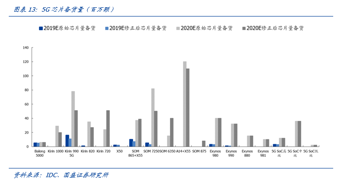 5G手机:5G手机放量元年,预期出货量达到2.5~3亿部。根据IDC预测,今年5G手机出货量为670万部,份额仅为0.5%。到2023年,5G手机出货量将达到整体手机出货量的26%。各家5G芯片供应商纷纷加足马力备货,我们预计2020年全球5G手机出货量为2.5-3亿部。联发科、高通、三星电子及海思等5G芯片供应商,都不断要求上、下游协力厂大举扩充产能,并有效拉高公司内外的库存水平。