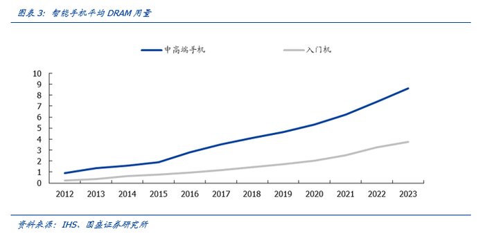 智能手机内存增长的趋势将持续保持。高端手机/旗舰手机主要搭载4GB或6GB,入门机主要搭载2GB。根据IHS,2019年智能手机平均存储消耗量为3.27GB,比2018年提升0.39GB。海力士在19Q3财报预计高端智能手机平均DRAM消耗量在2020年将达到5GB,5G升级将带动内存消耗进一步提高。