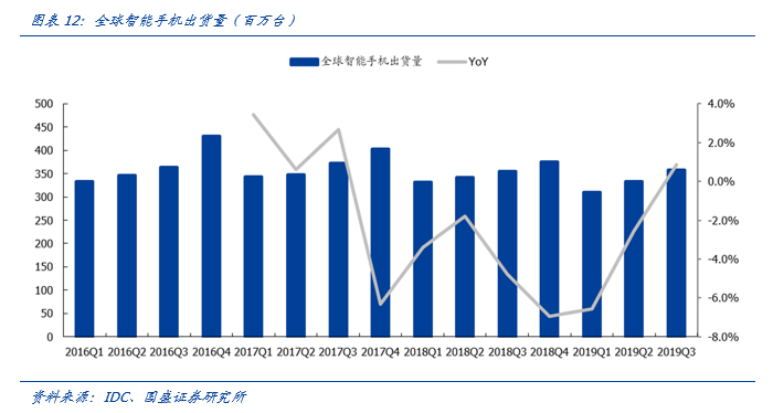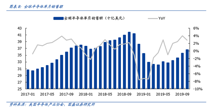 同样根据美国半导体产业协会的统计,在2019年全球的半导体单月销售额也进入了连续6月环比下降后的恢复期。而同时我们认为5G基站在2020年得以初步广泛铺设的大环境之下,消费电子,尤其是智能手机将迎来多季度下滑后的新增长,从而进一步带动半导体行业的周期性复苏。