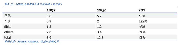 Apple Watch市占率最高,其次是三星和Fitbit。苹果持续主导着智能手表市场,从出货量来看,2019Q2苹果出货量570万台,同比增长50%,占据46.4%的市场份额,遥遥领先。其次是三星,市场份额为15.9%,美国Fitbit以9.8%的市场份额位列第三。IDC最新公布的报告显示,Apple Watch将在未来几年继续引领智能手表市场,份额占比保持在50%以上,并迅速拉升智能手表整体销量。三星和苹果这两款标杆性产品均使用OLED触控技术。