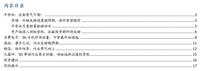 半导体:全球半导体景气上行拐点已经确立,我们认为行业拐点出现的逻辑为需求回升(消费电子、通信及数据中心)、产能利用率(晶圆、封测和存储)提升,推动报价上涨(存储、CIS-TSV等),同步带动原材料提升,未来资本开支力度增加拉升设备投资需求。目前看,存储价格在2020年1月有望提前上涨,半导体月度销售数据已摆脱萎靡之势,晶圆、封测产能利用率提升,资本开支在明年迎来回暖。