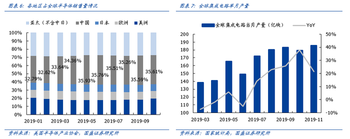 2019年全球集成电路的单月产量也印证了产业趋势以及全球周期在逐步上升。自19Q3的7月份开始,集成电路的单月产量已经摆脱了前期的萎靡之态,实现了从7月份开始的14%、23%、26%、28%、22%的逐月同比高增长。再看到逐月的全球半导体销售金额的占比情况来看,中国地区的销售额占比也是稳中略增长。
