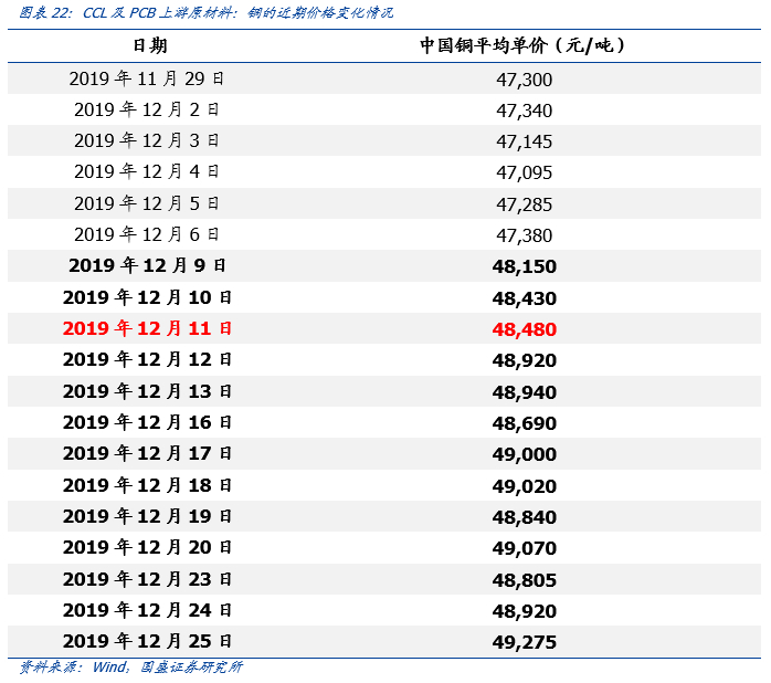 铜箔:铜价上涨,铜箔、CCL、PCB涨价有望持续传导,深度渗透。随着铜价在19年12月份开始的涨价,我们同样观察到PCB、CCL的上游原材料铜箔同样价格上涨。而CCL龙头之一的建滔同样决定在12月11日起上调其覆铜板产品的销售单价。我们认为随着铜价的上涨,而铜又是铜箔、CCL、PCB的主要原材料之一的情况下,价格传导至CCL已得到初步验证,而未来有望实现价格传导的深度渗透。同时5G所带来的景气向上,我们认为PCB的涨价及5G行情将继续向前。