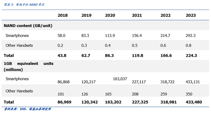 移动端闪存保持着37%的复合增长率!根据IHS,智能手机的NAND需求快速增长,2019~2023年保持37%的复合增长率。NAND需求增长反映着数据的爆炸性增长,智能手机闪存空间不断碰撞,同时闪存技术的升级与价格的下降也促进着高容量产品渗透率快速提升。
