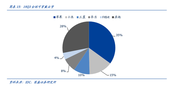 按品牌来看,根据IDC近日发布的《全球可穿戴设备季度跟踪报告》显示,19Q3全球可穿戴设备出货量总计达8450万部,同比增长94.6%,单季出货量创下新纪录。按出货量排名前5位的可穿戴设备公司分别为:苹果、小米、三星、华为和Fitbit,对应的出货分别为2950万部(市场占有率35.0%)、1240万台(市场占有率14.6%)、830万台(市场占有率9.8%)、710万台(市场占有率8.4%)和350万台(市场占有率4.1%)。