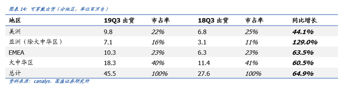 19Q3全球可穿戴设备共出货4550万台,同比大增65%。其中中国作为可穿戴产品出货量最多的地区,三季度总体出货1830万台,总体市占率为40%,同比增加61%。