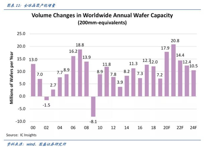 根据IC Insights,2020年全球将有10座新的12寸晶圆厂进入量产阶段,全球晶圆产能将新增1790万片8寸约当晶圆,2021年新增产能将创历史新高达2080万片8寸约当晶圆。新增产能主要来自于韩国大厂三星及SK海力士,以及长江储存、武汉新芯、华虹宏力等我国大陆半导体厂。