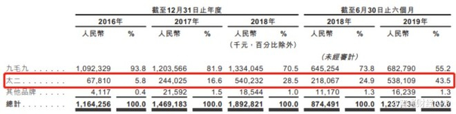 在整体业绩上,太二从2016年的6781万元大幅上升至2018年的5.4亿元,复合增长率为182.26%,并在2019年上半年近乎完成上年整年的业绩;在收入占比方面,2016年,太二业务收入占九毛九当期营业总收入的5.8%,直到今年上半年,这一比例已经扩大至43.5%。