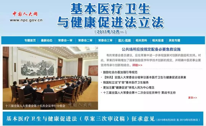 2017年12月以来,《基本医疗卫生与健康促进法》在全国人大常委会先后经历了4次审议,在中国人大网向社会公布,最终以国家法律的形式,对医疗卫生健康领域里的社会关系和行为进行了规范。