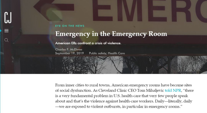 据美国曼哈顿研究院《城市杂志》的网站报道,美国急诊室的暴力事件呈上升趋势,美国急诊医师协会在2018年进行的一项调查发现,47%的急诊医师受访者表示曾遭受过身体攻击。超过60%的人表示,在过去一年里遭遇过袭击。大多数的攻击来自病人和病人家属。