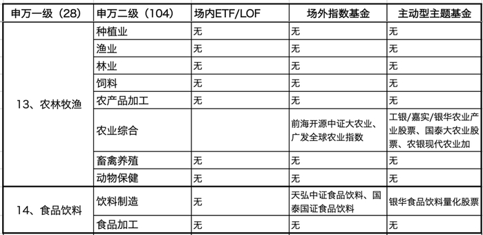 13、农林牧渔。从农业综合二级分类看,场外指数基金有前海开源中证大农业指数、广发全球农业指数QDII,主动型行业基金有工银农业产业股票、嘉实农业产业股票、银华农业产业股票、国泰大农业股票、农银现代农业加混合。14、食品饮料。从饮料制造二级行业分类看,场外指数基金有天弘中证食品饮料指数、国泰国证食品饮料指数,主动型行业基金只有银华食品饮料量化股票。