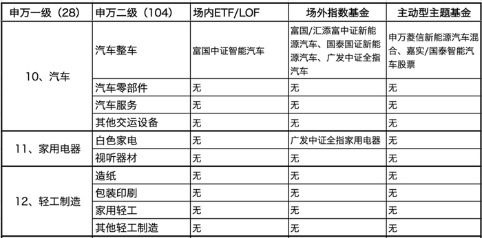 10、汽车。从汽车整车二级分类看,场内交易型基金是富国中证智能汽车ETF,场外指数基金有富国中证新能源汽车指数、汇添富中证新能源汽车指数、国泰国证新能源汽车指数、广发中证全指汽车指数,主动型行业基金有申万菱信新能源汽车混合、嘉实智能汽车股票、国泰智能汽车股票。11、家用电器。从白色家电二级分类看,只有广发中证全指家用电器这只场外指数基金。12、轻工制造。无对应基金。