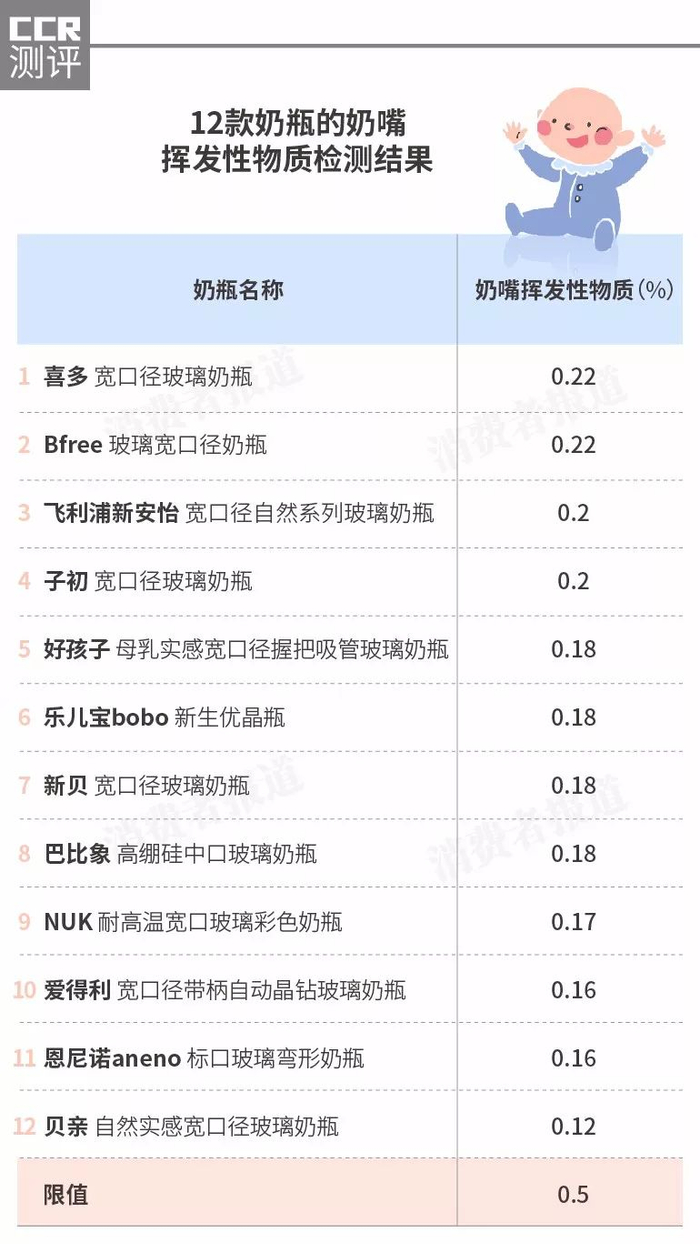 结果显示,12款奶瓶的奶嘴全部检出不定量的挥发性物质,含量在0.12%~0.22%之间,但均在国家要求的安全范围内,消费者无需过度担心。