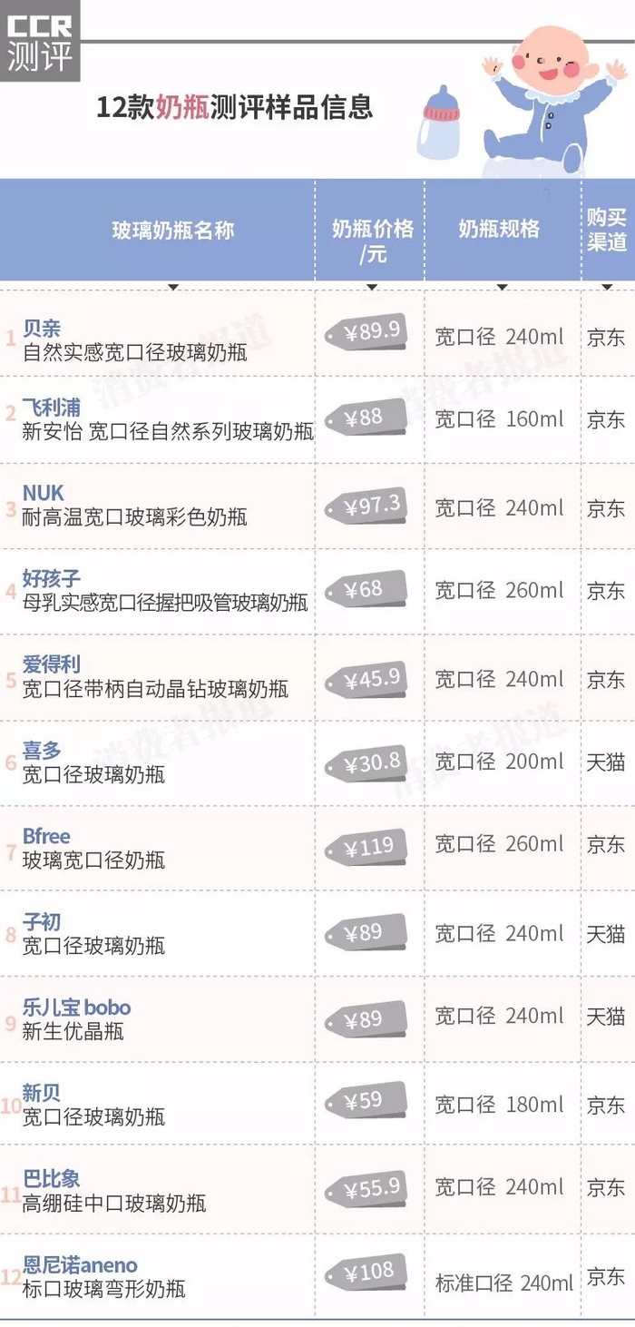 近期,《消费者报道》针对大家关心的两项指标:奶嘴中的挥发性物质、瓶身中的铅迁移量,对12款玻璃奶瓶进行了检测。