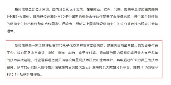 在彼时发布的投资爱贝信息的通稿里,麦达数字同样用“国内目前最早最大的聚合支付云平台”描述了爱贝信息。其还表示,爱贝信息在海外与20多个国家的相关合作伙伴签署合作备忘录,将中国全球领先的移动支付技术和经验向合作国家进行输出。核心团队来自华为、360等,有14项软件著作权。