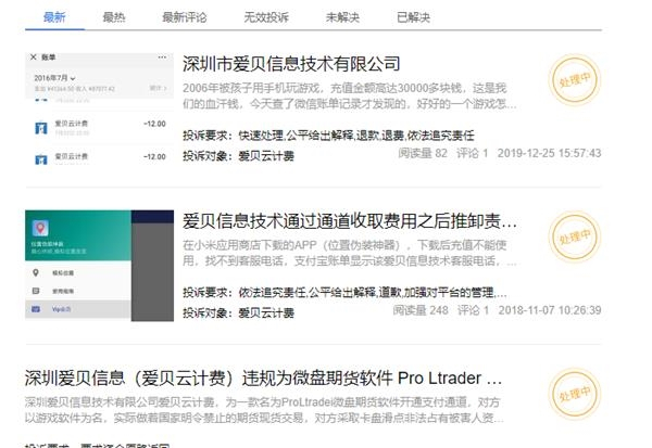 在21CN聚投诉平台上,有用户投诉称,爱贝云计费为一款名为 Pro Ltradei的微盘期货软件开通支付通道。对方以游戏软件为名,而实际从事国家明令禁止的期货现货交易,采取卡盘滑点非法占有被害人资金,诱导客户亏损。