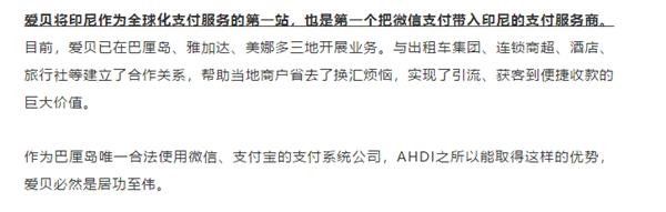 据爱贝信息公众号在2018年底的更新一篇名为《印尼央行发移动支付“新规”,这家中国公司成为“唯一”彩蛋》的文章,印尼央行(Bank Indonesia)对外表示,允许来自中国及国外的其它移动支付业者进入印尼市场,但有一个条件是“外国业者在印尼开展业务必须联手印尼当地的支付业者”,印尼只有一家支付系统公司能在巴厘岛合法使用微信和支付宝,就是Alto Halodigital International(AHDI),而AHDI是2017年爱贝信息与ALTO成立的合资公司。彼时,印度尼西亚商报对此也进行了报道,印尼央行银行记录显示,微信和支付宝已与四家聚合支付公司合作,AHDI为其中之一。
