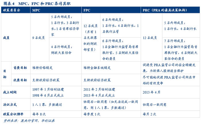 货币政策委员会,金融政策委员会,审慎监管委员会构成英央行的三大政策委员会,分别负责货币政策、宏观审慎和微观审慎三大职能。货币政策委员会(Monetary Policy Committee,MPC)负责制定基准利率、量化宽松等一系列货币政策,由9名成员组成,包括1名行长,3名分别分管货币政策、金融稳定、市场与银行的副行长,1名英央行首席经济学家和4名由财政大臣直接任命的外部委员。金融政策委员会(Financial Policy Committee,FPC)通过识别、监测和采取措施来减少英国金融系统的风险,以实现英央行金融稳定目标,由1名行长、4名副行长、1名负责金融稳定的执行主管、金融行为管理局的1名首席执行官、5名财政大臣任命的外部委员,和1名无投票权的财政部成员组成,委员会可依据宏观审慎措施向审慎监管局和金融行为监管局提出建议和指示。审慎监管委员会(Prudential Regulation Committee,PRC)是英央行下设审慎监管局(Prudential Regulation Authority,PRA)的最高决策机构,负责监管银行、保险公司和投资公司,由1名行长,2名分别负责金融稳定、市场与银行的副行长,1名审慎监管首席执行官,1名金融行为监管局的首席执行官,1名经财政大臣同意、行长任命的成员(现为负责货币政策的副行长),和至少6名财政大臣任命的外部成员组成。