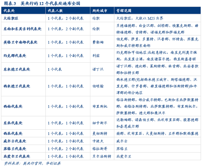 英央行的最高领导机构是董事会,下设遍布全国的代表处。英央行的最高领导机构是董事会,负责制定组织战略,确保银行高效合理地履行职能与利用资源。英央行的最高执行团队是1名行长,4名分管货币政策、金融稳定、市场与银行、审慎监管的副行长,和1名COO,行长由财政大臣提名,5名行长都是董事会成员,COO由董事会任命,与副行长享有同样的薪酬和地位。英央行在全国各地设置12个代表处,深入了解国内经济运行情况,为货币政策和审慎政策决策提供支持。