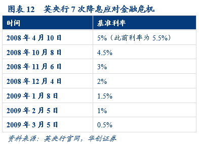 2008年至2009年英央行7次降息将利率下调至0.5%。由于全球性的金融危机迅速蔓延,并从金融体系迅速传导至整个实体经济,英国经济出现滞涨,GDP增速由正转负,通胀和失业率陡升。为应对危机,自2008年4月至2009年3月,英央行7次降息,将基准利率从5%下调至0.5%。