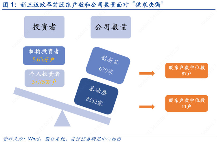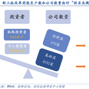 新三板改革前股东户数和公司数量面对“供求失衡”。数据来源:安信证券