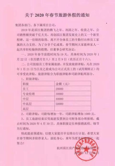 12月24日,房企滨江集团内部发布了一则《关于2020年春节旅游休假的通知》,该通知显示,为分享千亿成果,董事会决定将2020年春节放假时间定为19天,放假期间携家属旅游的员工可享受旅游津贴,最低2万元。