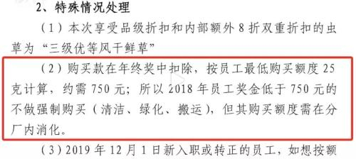 值得一提的是,2019年12月1日前转正的生产线员工,每人最少购买25克,非上述1--5类人员如需超额购买的,最多不超过1000克。文件显示,购买款在年终奖中扣除。