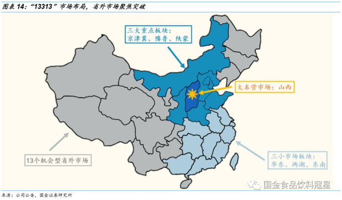 “13313”市场布局,省外市场聚焦突破,向全国性品牌目标迈进。2019 年公司确定了一个大本营市场(山西),三大重点板块(京津冀、豫鲁、陕蒙),三小市场板块(华东、两湖、东南),13 个机会型省外市场组成的市场格局,简称“13313” 格局。通过市场分级筛选,按照市场特点分策打造、精耕细作,省内市场确保快速增量与良性发展,省外市场聚焦突破。加强渠道建设与消费者培育,因地施策,聚焦资源,各区域按照公司的整体战略稳步推进,针对华东、东南、两湖三小板块市场,以重点地级市、重点区县为推进主体,结合基础建设终端拓展为策略打造汾酒营销重点城市群。