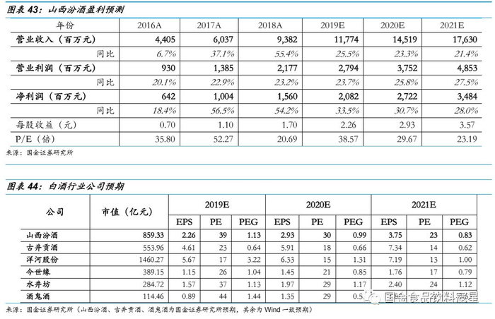 作为清香龙头,区域强势酒企,我们认为随着次高端扩容,清香品类需求的增长以及国企改革的持续落地,结合近年来省内经济升级,省外扩容发展的背景,我们给出盈利预测:预计2019-2021年收入分别为117.7亿元/145.2亿元/176.3亿元,同比+25.5%/23.3%/21.4%,归母净利分别19.7亿元/25.6亿元/32.7亿元,同比+34.0%/30.0%/28.0%,对应EPS分别为2.25元/2.93元/3.75元,目前股价对应19/20/21年PE分别为39X/30X/23X。给予2020年38倍PE,目标价为111.38元,首次覆盖给予“增持”评级。