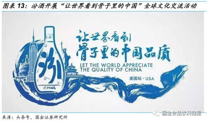 中国品质、中国气派与中国精神。汾酒曾作为70年前共和国第一国宴的首款用酒,“骨子里的中国”具象为三个层面,分别是中国品质、中国气派与中国精神。这也正是近年来汾酒集团以青花汾酒为核心载体,向外界做出的“三个表达”:“中国品质”表达的是“远超国际食品安全标准”、“中国气派”表达的是“世界眼中的中国气派”、“中国精神”表达的是“中国人骨子里的精气神”。公司积极实施“走出去”传播战略,开展“汾酒全球行”系列活动。2017年,汾酒旗下两大优秀品牌——青花汾酒、竹叶青酒成为第七届欧亚经济论坛唯一指定用酒,进行四位一体的整合数字营销,公关线、传播线、终端线和互动线同时发力;2018年,汾酒在纽约、巴黎、莫斯科等全球重点城市,开展“让世界看到‘骨子里的中国’”一带一路全球文化交流活动,通过与世界各地消费者的直接交流,让汾酒品牌远播于世界各地,向世界展现了汾酒的风采。