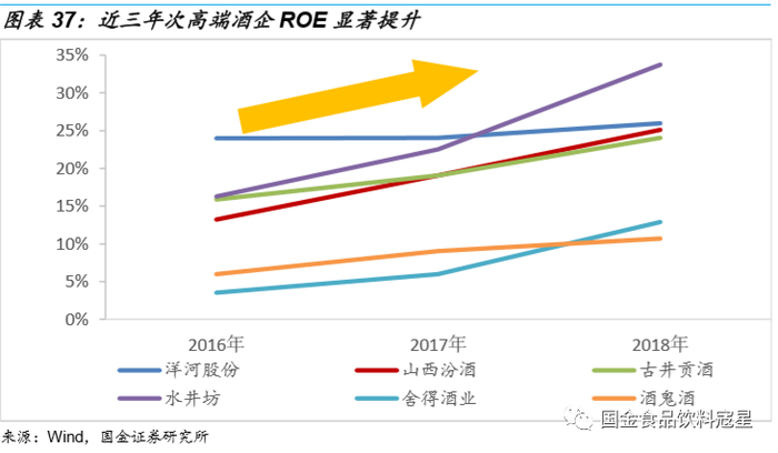 次高端酒企近三年ROE逐年提升,汾酒2018ROE处于较高水平。2018汾酒ROE(加权)为25.59%,仅次于水井坊(35.27%),高于洋河股份(+23.56%),古井贡酒(+23.22%),舍得酒业(+11.1%),酒鬼酒(+9.38%)。