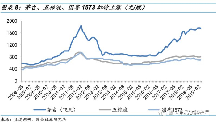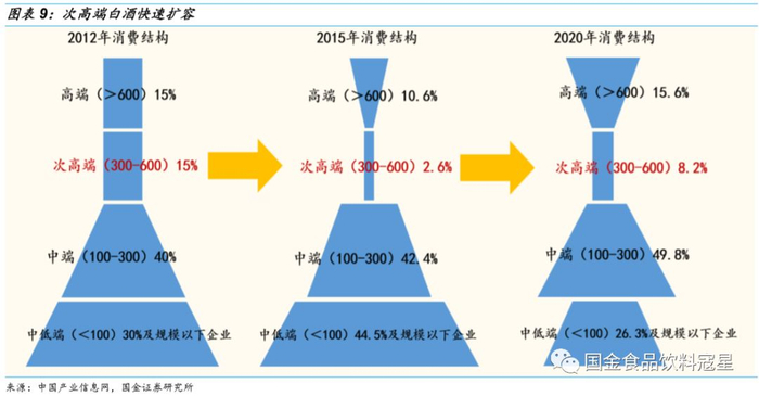 高端白酒价量齐升,促进次高端快速扩容。次高端白酒所处的价格带(300-600元)处于一线高端白酒(600元以上)和大众普通消费价格带(100-300元)之间,因此其未来发展与两个价格带的走势高度相关,尤其是高端白酒。随着高端白酒(茅台、五粮液、泸州老窖)的强劲动销,白酒行业的天花板不断被突破,白酒的万亿规模已经打开,高端白酒量价提升,为次高端提供了一定的上升空间,促进次高端白酒快速扩容。