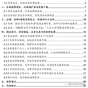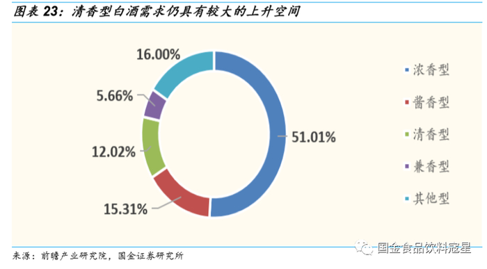 差异化竞争优势,发展潜力较大。清香型白酒清香纯正、醇甜柔和、自然谐调、余味爽净,在口味上与其他香型的白酒有着较为显著的差异,具有差异化竞争优势。随着人们对于饮食健康关注度的不断提升,具有一定保健功效的清香型白酒预计在未来有较大的发展潜力。