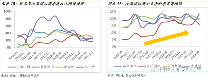 白酒行业结构调整,次高端增长最为明显。目前,次高端白酒公司营收的扩容速度达到26%左右,近3年营收复合增速平均为47.39%,净利润率在近三年来显著提升,达到20%左右。而中低端的容量增长速度在逐渐变缓甚至容量在逐渐减少,整个白酒行业升级明显。以次高端“四小龙”为例,近年来次高端白酒净利率显著提升,盈利能力增强明显;营收规模快速增长。