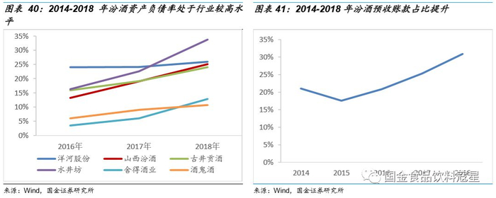 资产负债率处于同业较高水平,但主要是由于预收款项引起的,说明公司具有良好的议价能力。2018年底汾酒资产负债率达到45.21%,处于同业较高水平:洋河股份32.16%、古井贡酒35.81%、水井坊41.94%、舍得酒业43.94%、酒鬼酒24.06%。2014-2018年汾酒资产负债率逐年提升,但具体分析可以发现其资产负债率的增长主要是由于预收账款的增加引起的:从右下图可以看出2014-2018年汾酒预收账款占比显著提升,而18年预收账款则占到了总负债的30.92%。预收账款的增加恰恰表明了经销商打款意愿的增加与公司议价能力的提升,且预收账款带来了经营现金流的增加,现金流表现良好,销售收入与现金流总体比较匹配。此外,公司近十年都没有有息负债,流动比率和速动比率均保持在不低于1的水平。