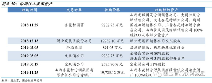 集团资产注入,减少关联交易,改善公司治理体制。公司目前已经完成集团酒类及相关业务收购,从而实现资源整合,提升公司综合竞争力和盈利水平。2018 年 11 月公司以 9282.75 万元收购汾酒集团子公司杏花村国贸的部分资产;2018 年 12 月公司以 1.22 亿元收购汾酒集团子公司酒业发展区销售公司 51%股权;2019 年3 月公司分别以 9945.04 万元和 891.03 万元收购义泉涌公司和汾酒集团部分资产;2019 年 6 月公司以 2575.70 万元收购宝泉涌公司 51%股权。一系列收购行动将有助于通过资源整合、聚焦主业,增加公司的酒曲产量、提升白酒产能,推进酒业一体化进程。2019年6月7日公司发布《山西杏花村汾酒厂股份有限公司关于2019年度日常关联交易计划的公告》,公司根据生产经营计划情况公开承诺2019年日常关联交易总金额控制在22亿元以下,2020年控制在20亿元以下。2019年上半年公司成立关联交易管理小组,完善关联交易管控机制,强化关联交易管控机制的执行,数次组织召开由公司管理层、关联单位及各分子公司负责人、财务总监参加的关联交易专题会议,进一步加强公司管理。近三年来公司关联交易规模逐年增加的情况将得以改善,将促进公司生产和销售体系的整合优化,助力汾酒品牌进一步做大做强,公司持续、稳定、健康发展。2019年11月26日公司发布《关于收购山西杏花村汾酒集团有限责任公司汾青酒厂100%股权暨关联交易的公告》,公司拟支付19,725.12 万元收购山西杏花村汾酒集团有限责任公司汾青酒厂100%股权,此交易于 2019 年 11 月 25 日在山西省汾阳市签署了交易协议,将进一步提升公司市场竞争力和盈利能力,提高白酒产能,同时进一步减少同业竞争和关联交易,推动集团整体上市的战略目标的实现。