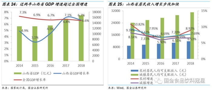 近两年经济增速有所提升,居民收入增长步伐加快,购买力提升带来白酒需求增长潜力。消费是经济增长的重要动力。随着高端白酒回归大众消费,消费结构变化将是影响白酒行业发展的主要因素之一。“十三五”期间山西消费结构升级趋势明显,经济的快速发展带来人均收入的提高,使得消费者的购买能力得到进一步的增强,这有助提升白酒的总体消费,也为次高端白酒需求增长带来动力。