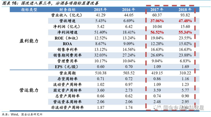国改进入第三年,汾酒各项指标显著改善。相比于15、16年,可以看到从17年开始汾酒各项指标改善显著,盈利能力与营运能力都得到大幅提升:营收、净利润增长迅速;净利率和资产报酬率显著提升;销售期间费用率也显著下降,说明费用投放后产出率有所提高;各项资产周转率显著提升,营运效率显著提高。